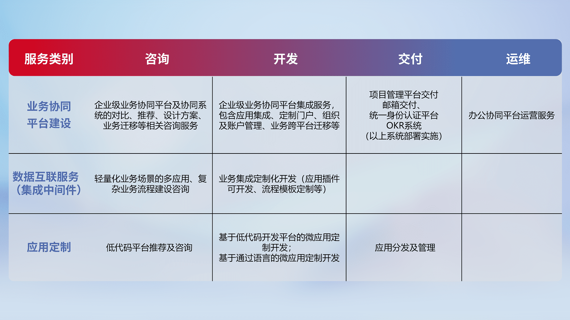 针对钉钉、、、企微、、IDaas等平台级产品提供产品的规划、、、、方案、、、交付、、定制化开发等服务,,,实现如统一协同办公、、、、智能客户服务、、混合会议管理、、智能数据查询、、、、等业务场景,,,实现数字化转型。。。